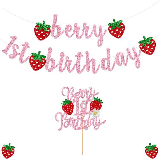 Berry First Birthday Decorations Banner Glitter Strawberry Happy 1st Banner Berry Birthday Cake Topper for Strawberry Theme Baby Shower y Party