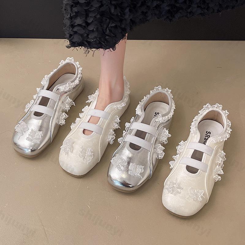 Damen Ballerinas Spitze Quadratische Spitze 2026 Sommer Herbst Kleid Weiches Leder Elegante Mary Jane Schuhe Outdoor Freizeitschuhe
