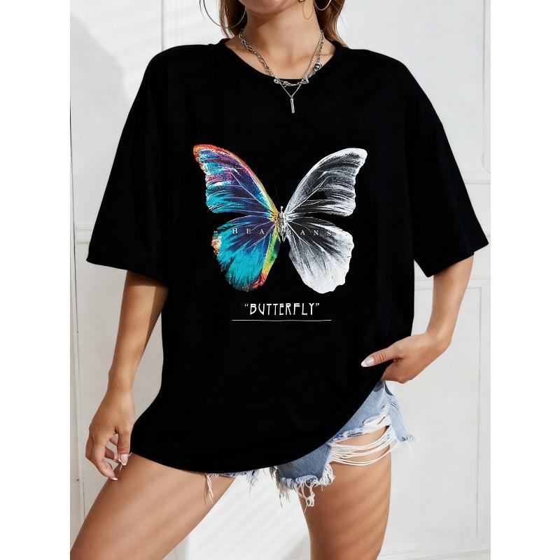 Übergroßes T-Shirt mit Schmetterlingsdruck Weiß Buntes Schmetterlings- und Textdesign Lässige Alltagskleidung