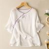 Damen Bluse im Vintage-Stil, lockere Passform, bestickt, Knopfleiste vorne, Baumwoll-Leinen-Mischung, Dreiviertelärmel