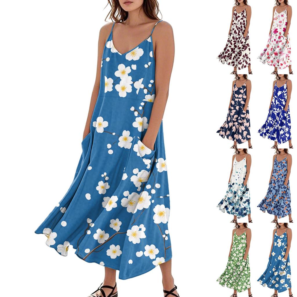 Damenmode Lässig Ärmellos Tasche Langes Strandkleid mit Blumendruck