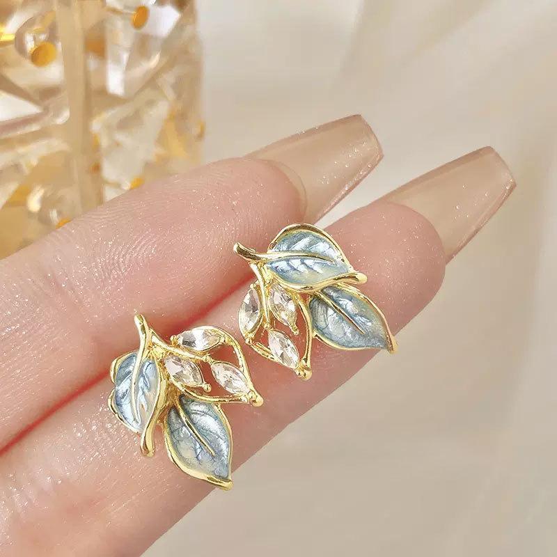 Simple Oil Dripping Rhinestones Leaf Stud Earrings For Women Fashion Personalized Daily Accessory Party Jewelry Birthday Gifts
