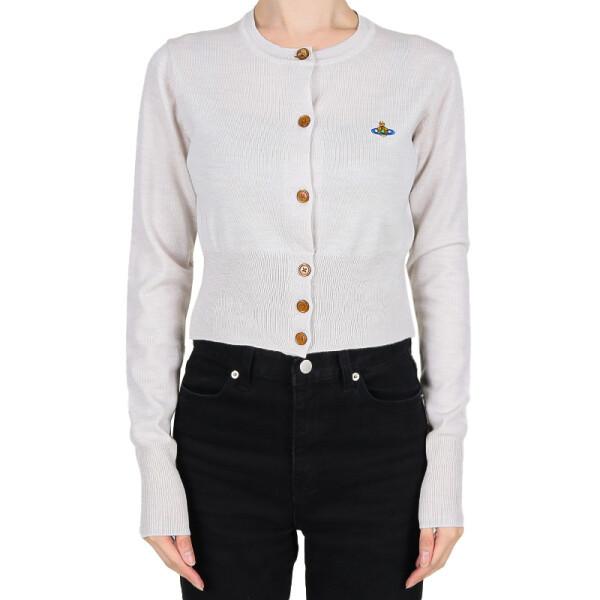 The Vivienne Westwood Women's Wool Crop Cardigan features a round neck design and a cropped length, providing a comfortable yet sophisticated look. Made from 100% VIRGIN WOOL, it exudes elegance and comes in a beige color that pairs well with various outfits.