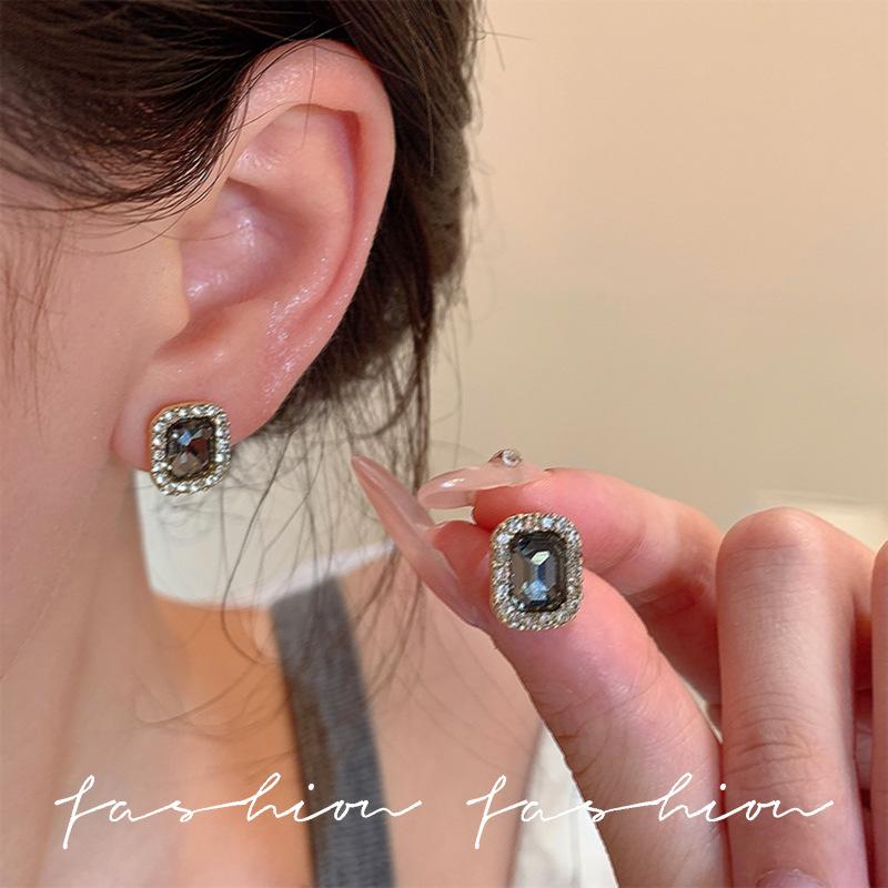 Unique black crystal square stud earrings, small and exquisite earrings, new trendy high-end temperament earrings in 2025.