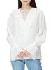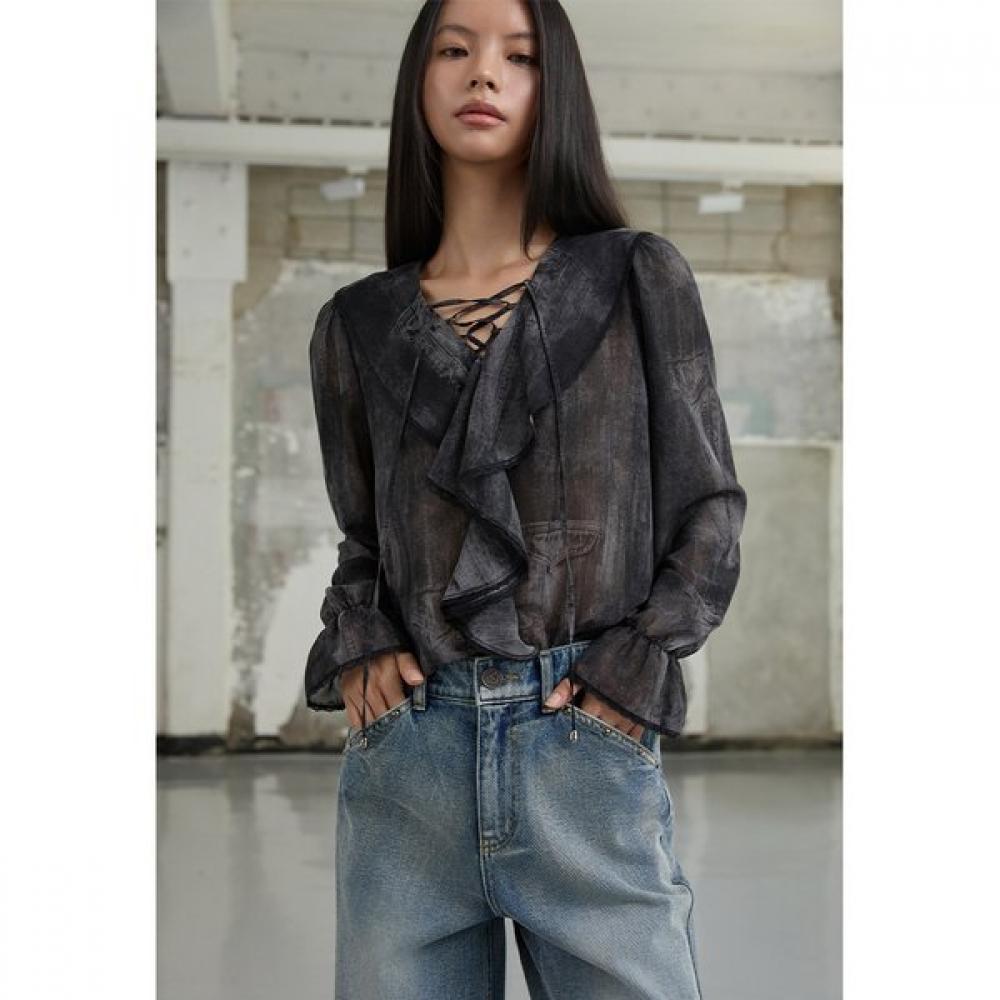 The [BLUE LABEL] Ruffle Lace-Up Blouse (ER3OBL01) is made of lightweight chiffon polyester, showcasing a feminine silhouette. The lace-up neckline detail serves as a point of interest and pairs well with skirts, allowing for a trendy style.