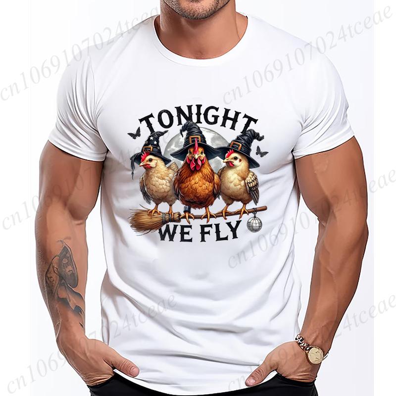 Halloween Tonight We Fly TShirt for Women Men Chicken Witches Hat Funny Casual TShirt Spooky Witch Men TShirts Clothing Tops