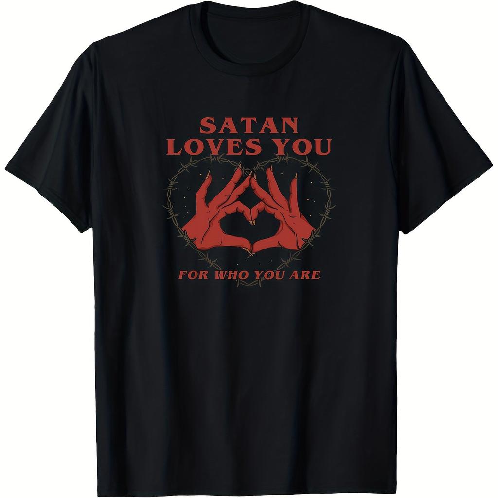 Mens Satan Loves You for Who You Are Graphic TShirt Cotton Casual Comfortable Black with Red Heart Design Christmas