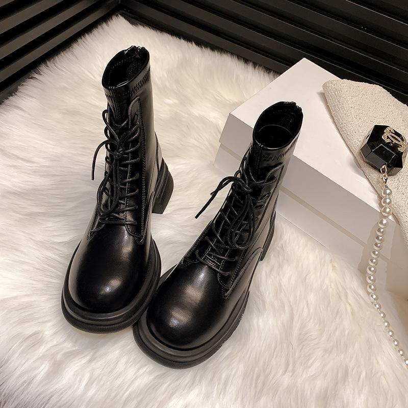 New thick-soled Martin boots with heightened elasticity and thin boots for women's thick-heeled lace-up short boots and velvet women's boots
