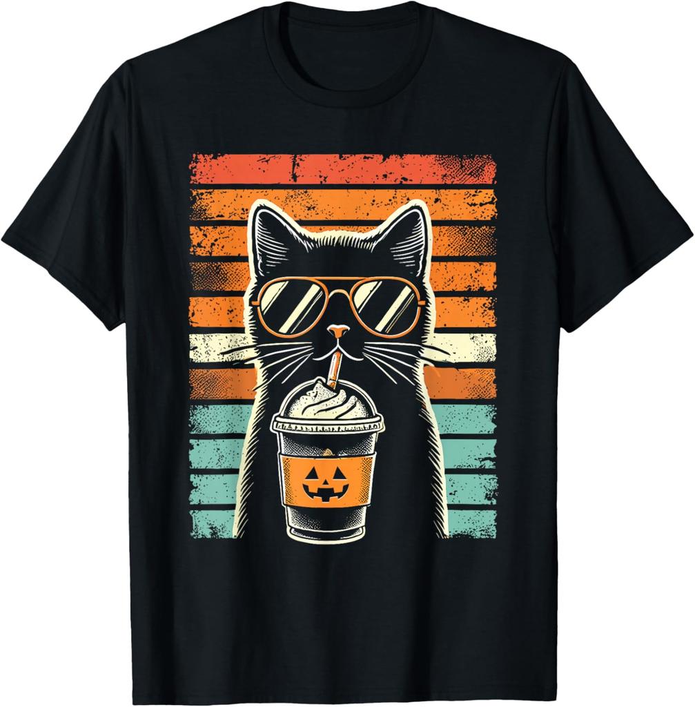 Black Cat Pumpkin Spice Latte Hipster Graphic Tee Retro Distressed TShirt Casual