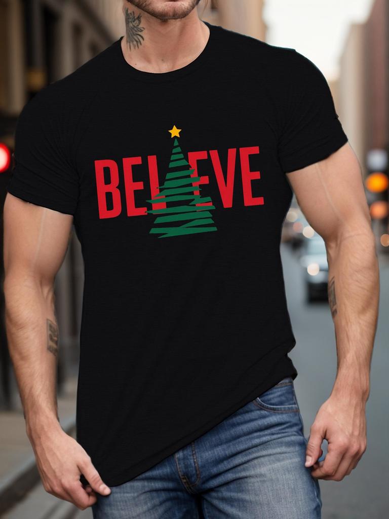 Believe Christmas Tree Graphic Mens Cotton TShirt Casual Short Sleeve Round Neck Tee