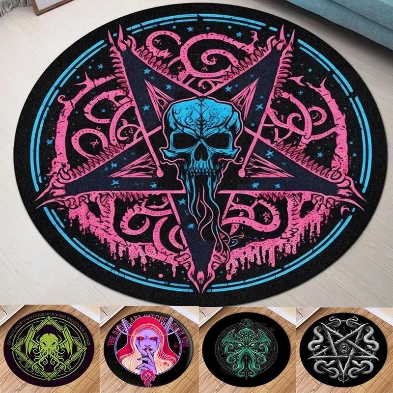 Pentagramm Schädel Cthulhu Magischer Kreis Runder Teppich Hexe Gothic Rock Interieur Mystisches Blau Rosa Hölle Dekoration