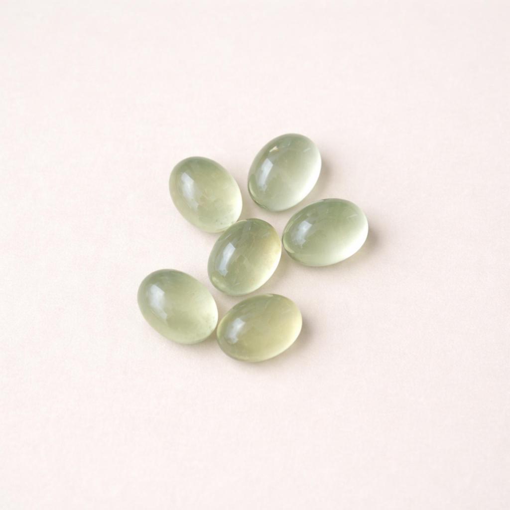 Natürliche Prehnit-Edelsteine mit einem sanften hellgrünen Farbton und einer glatten, oval geschliffenen Oberfläche. Diese eleganten Prehnit-Cabochons eignen sich perfekt für Ringe, Anhänger, Ohrringe und minimalistische handgefertigte Schmuckdesigns.