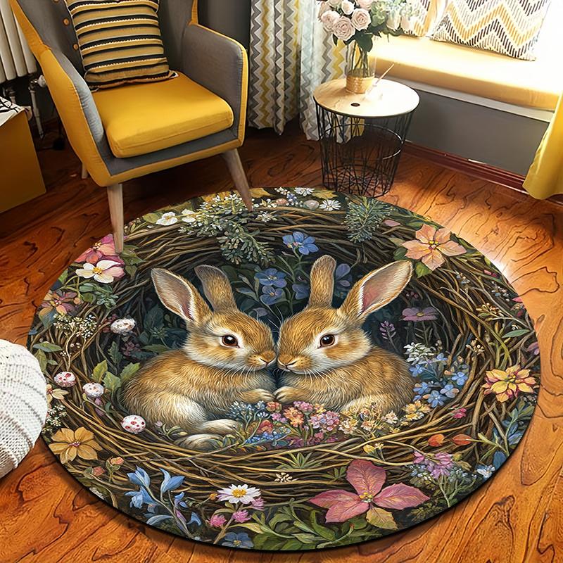 1Pcs Rabbit Floral Round Rug Non-Slip Machine Washable Floor Mat 2D Flat Soft Pastel Area Rug for Living Room Bedroom Easter Decor