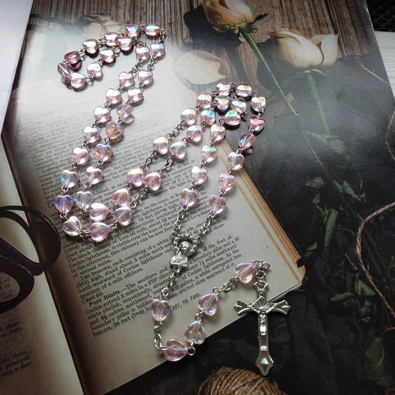Rosa Liebesherz Rosenkranz Halskette Jungfrau Maria Christus Jesus Kreuz Anhänger Halskette Damen Herren Katholischer Schmuck Geschenk