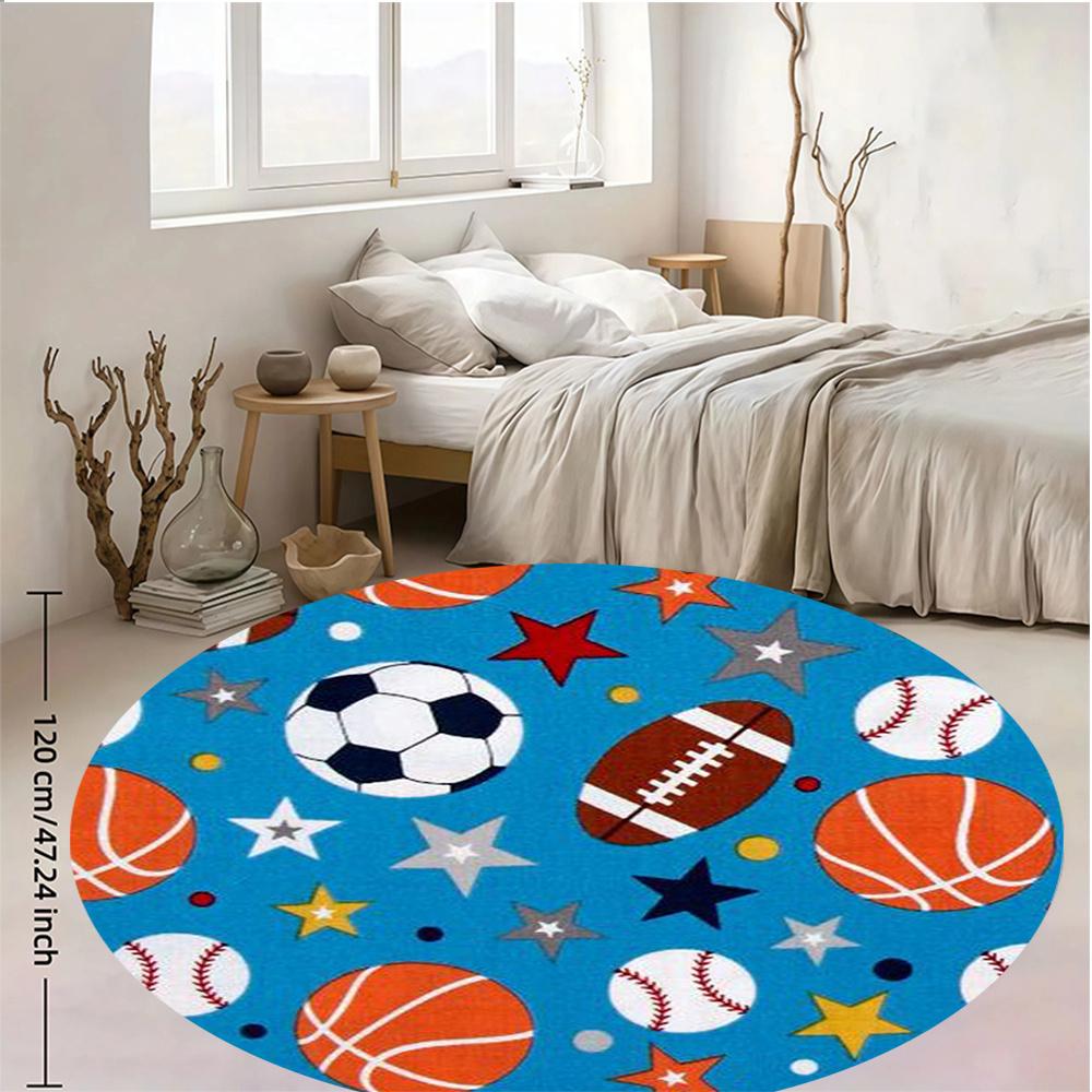 Bedruckter runder Flanellteppich mit Basketball-, Fußball- und Baseballmuster für Kinderzimmer oder Spielbereiche, weich, rutschfest