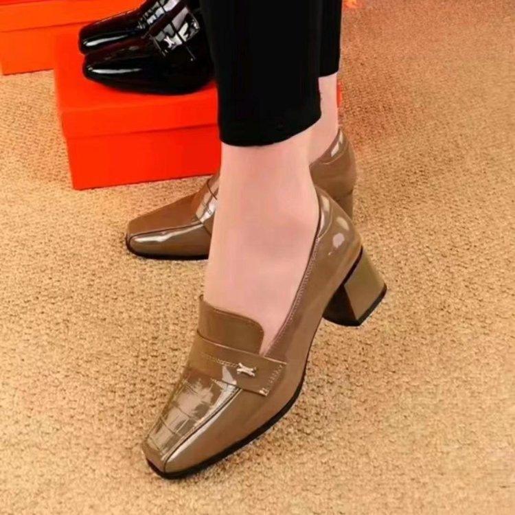 Dicker Absatz Quadratischer Zeh Einzelne Schuhe Neuer Herbst Weiches Leder Britischer Stil Kleine Lederschuhe Frühling Mittlerer Absatz Lackleder