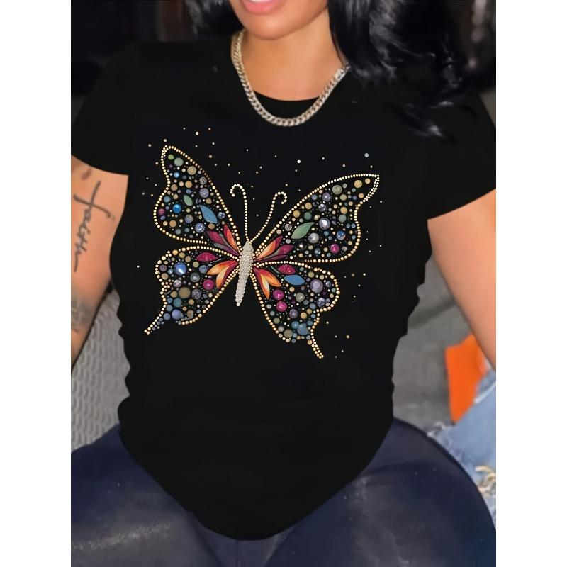 Europäische Größe Damen Schmetterlingsdruck Rundhals T-Shirt Kurze Ärmel Lässiges Oberteil Frühling Sommer Kleidung