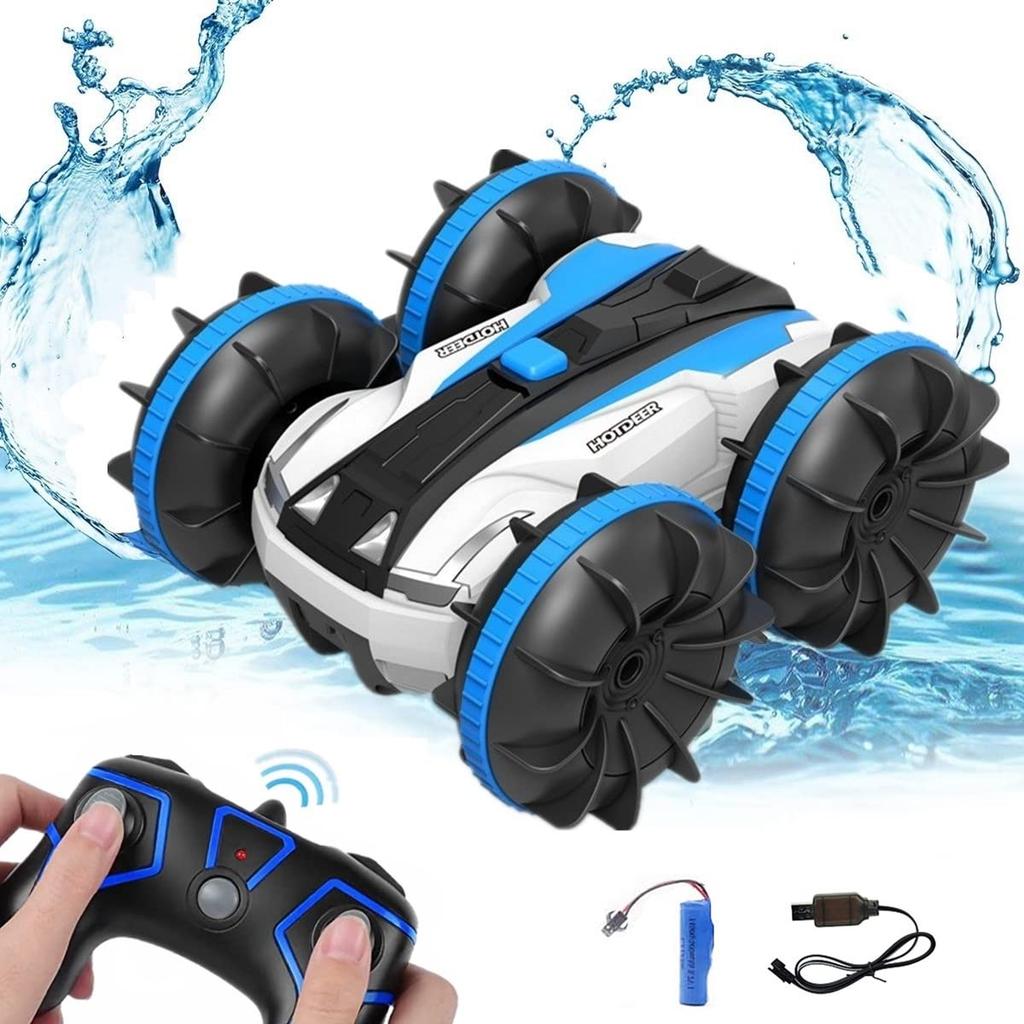 WEECOC RC Boat, Amphibious Stunt Car, High Speed, 4-Wheel Drive, 360-Degree Rotation, USB Rechargeable, Shockproof, Kids Gift (Blue)