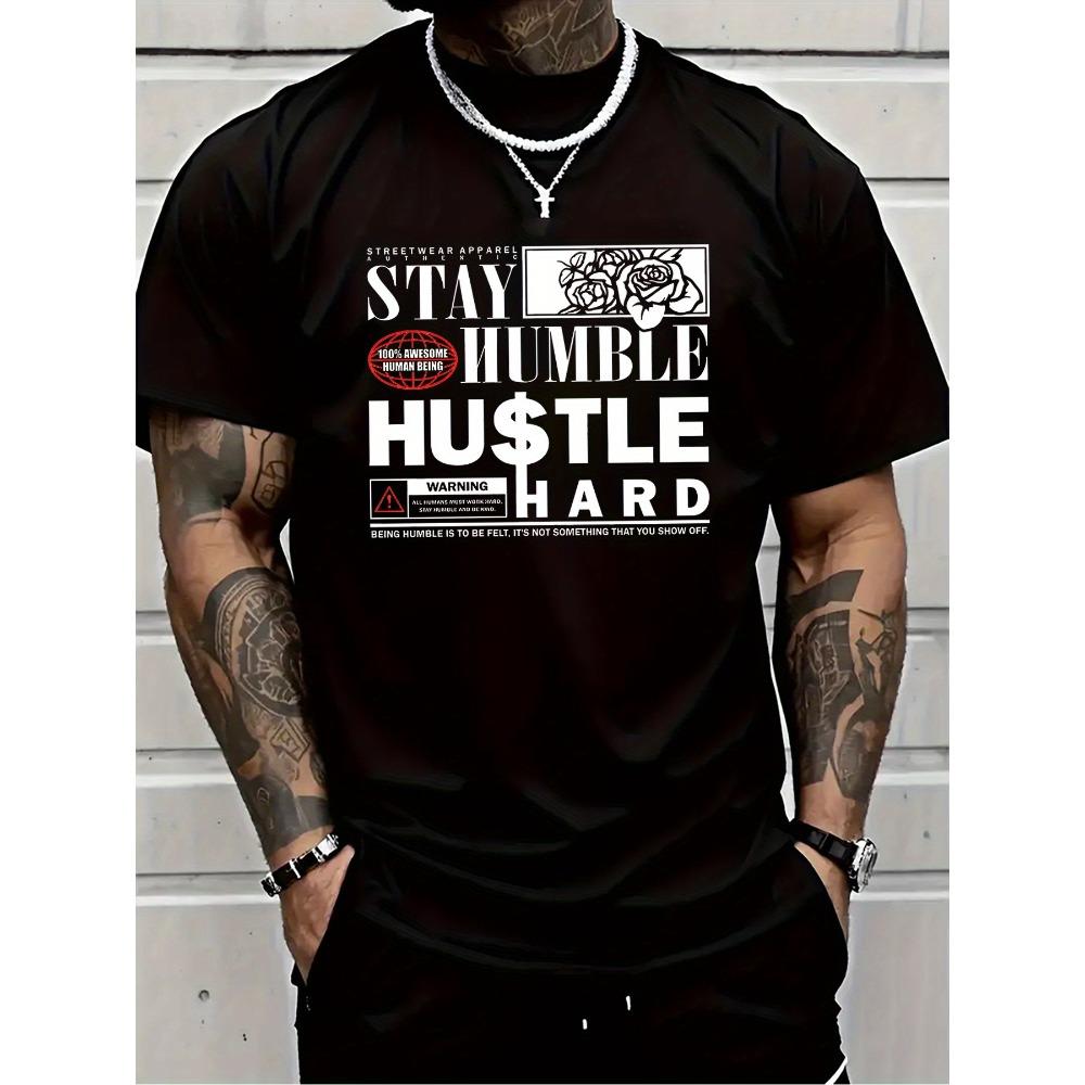 Europäische Größen Herren Inspirierendes T-Shirt - Bleib bescheiden, arbeite hart Musterdruck, Kurzarm, Rundhals - Atmungsaktiv und waschbar - Fitnessstudio Outdoor-Aktivitäten