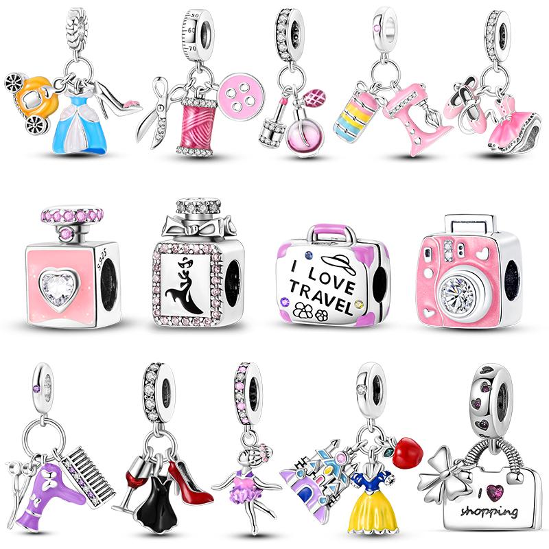 925 Silver Charms Lipstick Perfume High Heels Handbag Dress Camera Pendant Fit Original Pan Bracelet Bead DIY For Woman