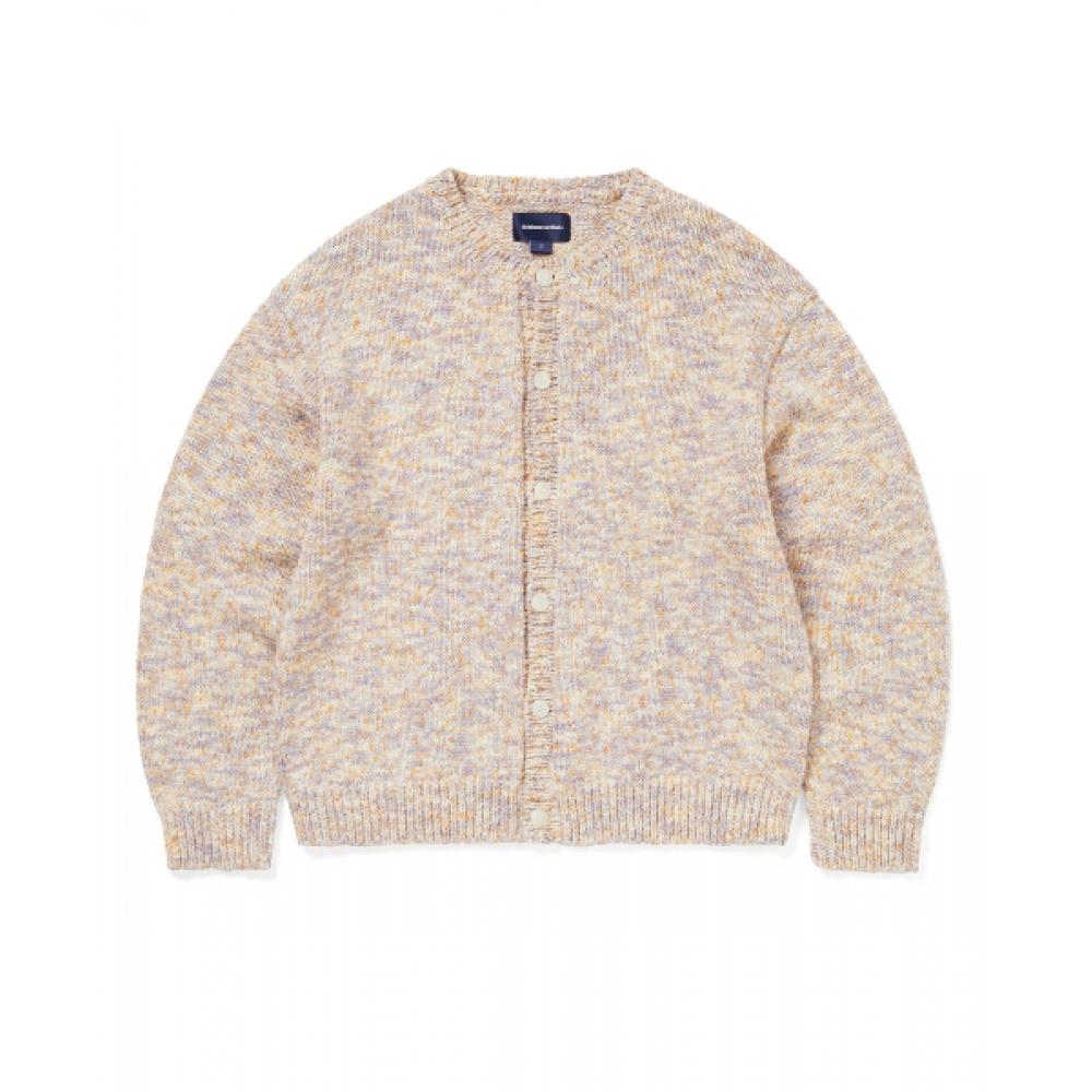 The THISISNEVERTHAT Rainbow Knit Cardigan Violet features a regular fit and has undergone garment washing. It is designed with a front button closure, and the collar, cuffs, and hem are ribbed for a stylish finish. A flag label is attached to the side seam, accentuating the brand's uniqueness.