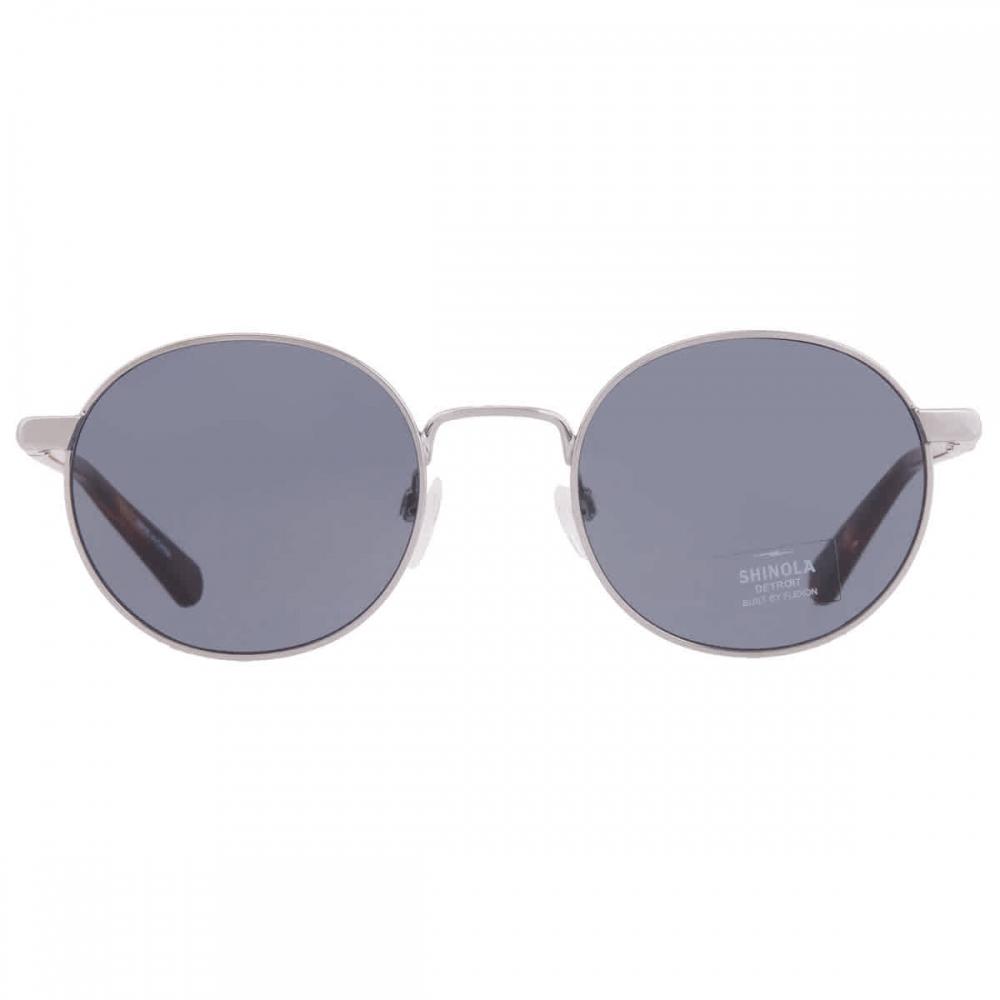 The Shinola Blue Round Unisex Sunglasses (SH2301S 045 51) feature a sophisticated round shape. With a lens width of 51mm, a bridge of 21mm, and arm length of 145mm, they provide 100% UV protection. The non-polarized lenses and full-rim style enhance their elegance, while the shiny silver frame is crafted from Flexon material. The lenses are blue, exuding a contemporary charm.