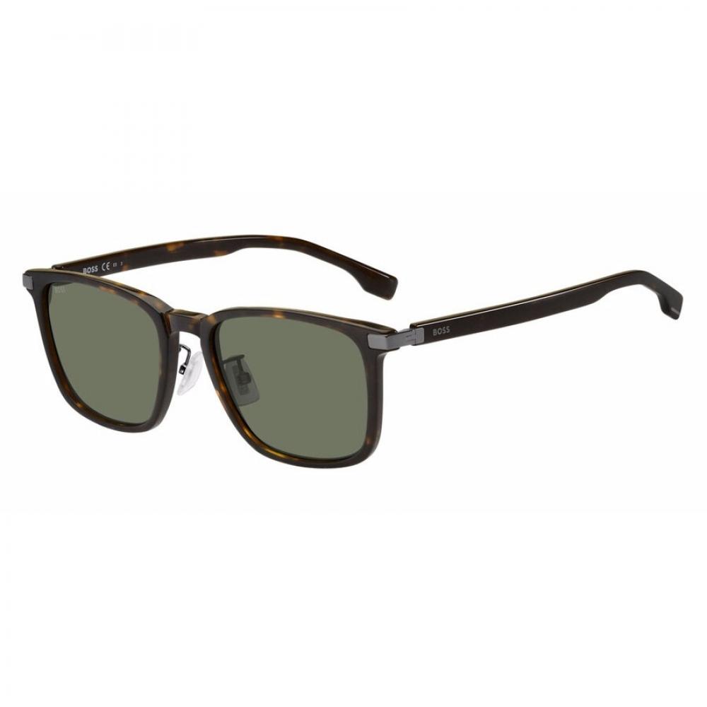 The product name is "Hugo Boss Green Sport Men's Sunglasses BOSS 1406/F/SK 0086/QT 57". The color is Tortoise, and the lenses are in green. It features a full-rim design with 100% UV protection. The frame material is made of Acetate, providing a flexible and lightweight construction.