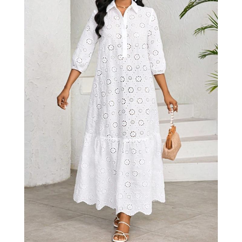 Einfarbiges Sieben-Viertel-Ärmel Lockeres Hemdkragen Hohlspitze Temperament Kleid