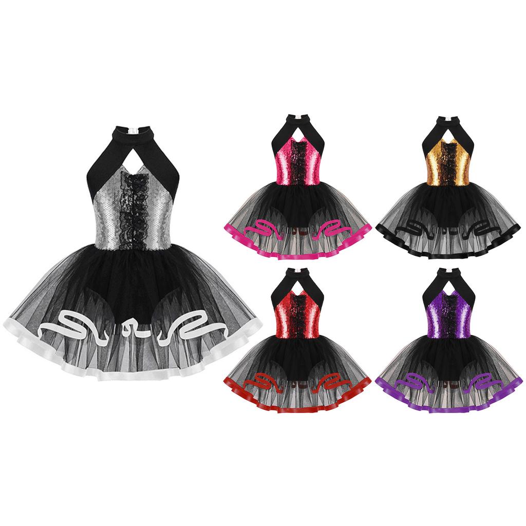 Kinder Mädchen Glitzer Pailletten Tanz Tutu Ballett Kleid Neckholder Gymnastik Trikot Modern Latin Jazz Tanzen Performance Kostüm