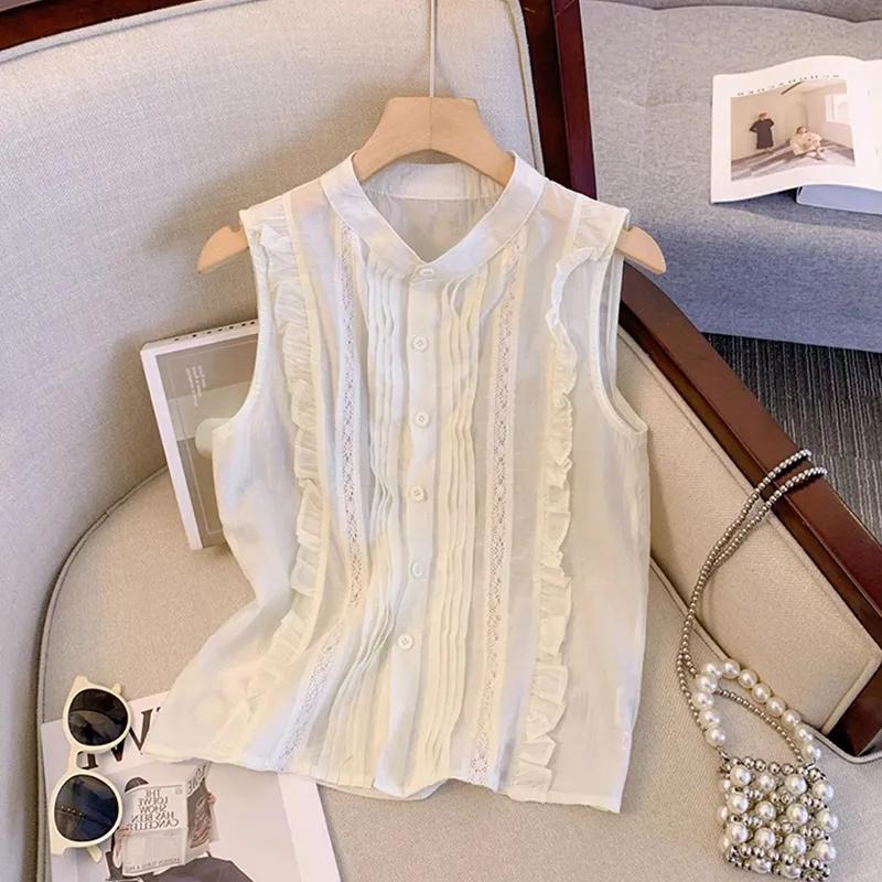 Women's White Sleeveless Blouse Ruffle Trim Lace Panel Button Front Loose Fit Casual Top