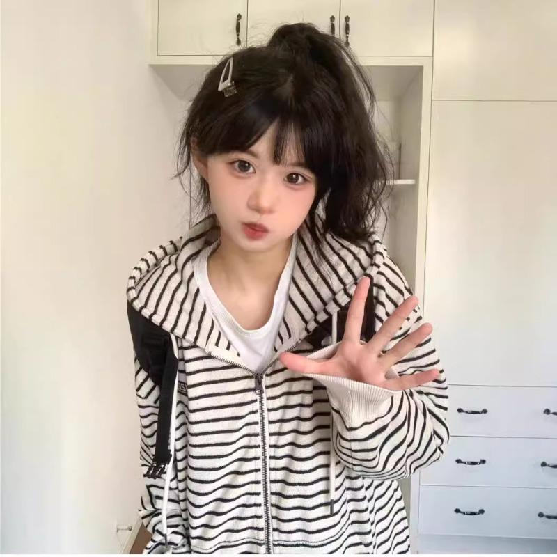 Amerikanischer Stil Lässiger Cardigan Gestreifte Sweatjacke für Damen Frühling Herbst Winter Neu Locker Mit Kapuze Hongkong Stil Oberteil