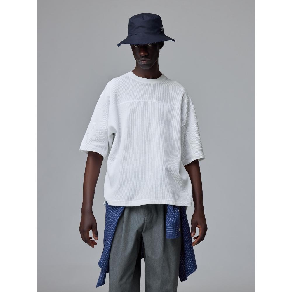 This waffle T-shirt is part of the GU × UNDERCOVER collection, featuring a basic design with a unique twist. The cutoff sleeve and exposed seam detailing showcase UNDERCOVER's identity. With an oversized style and a tapered silhouette that flatters the waist, it presents a casual yet elegant appearance. The moisture-wicking function ensures comfort throughout the year.