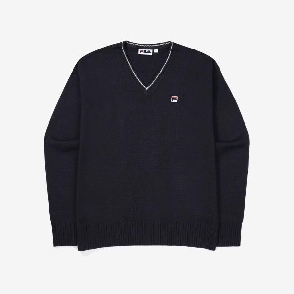 The FILA F-BOX V-neck knit sweater is a unisex knit made from a wool blend, suitable for transitional seasons. It features a V-neck design with color points and adds luxury with FILA's signature F box and pen detail. This long-sleeve sweater has a basic hip-length and comes in Charcoal.