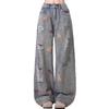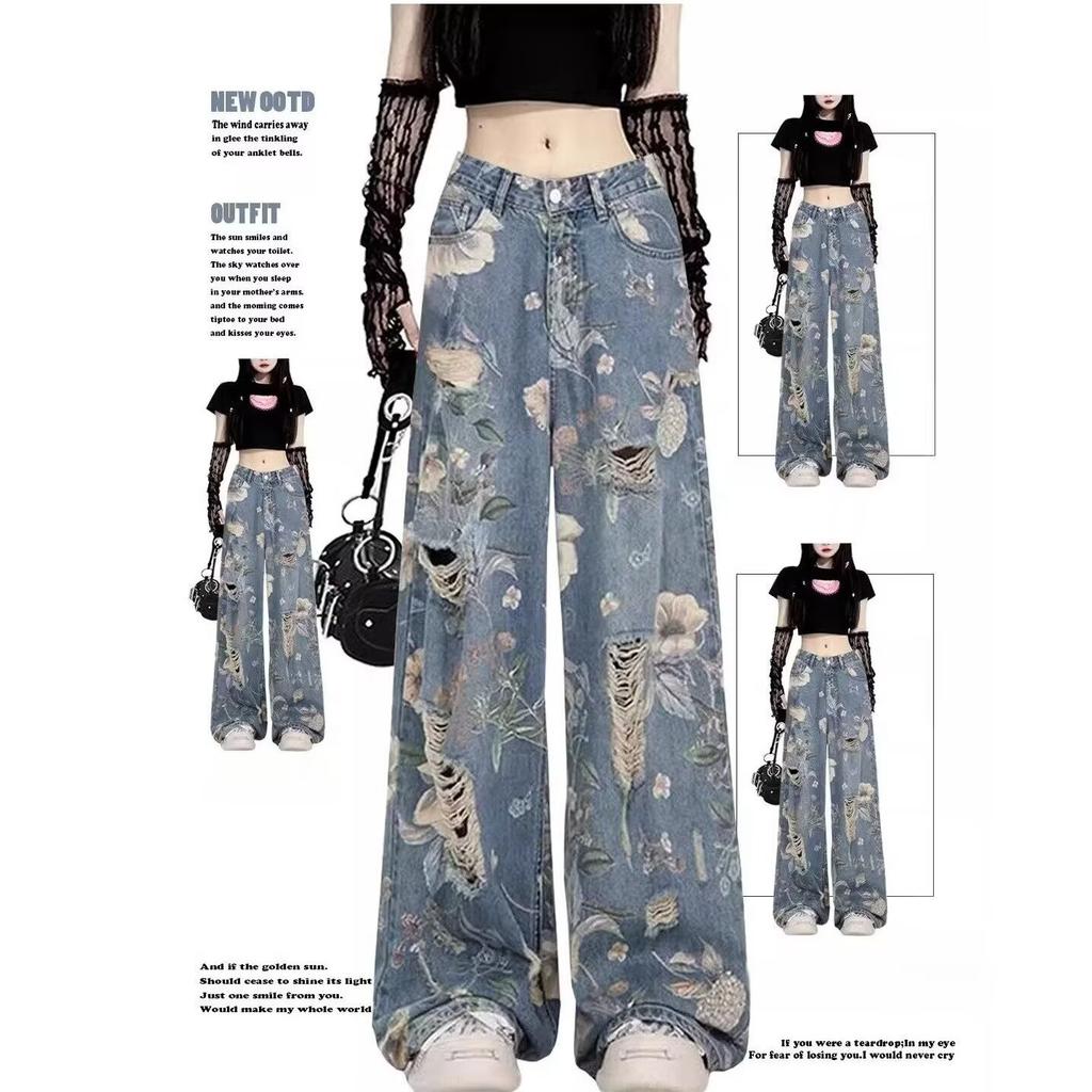Sommer neue Vintage bedruckte zerrissene Jeans Damen lockeres Design gerade bodenlange Wide-Leg-Hosen