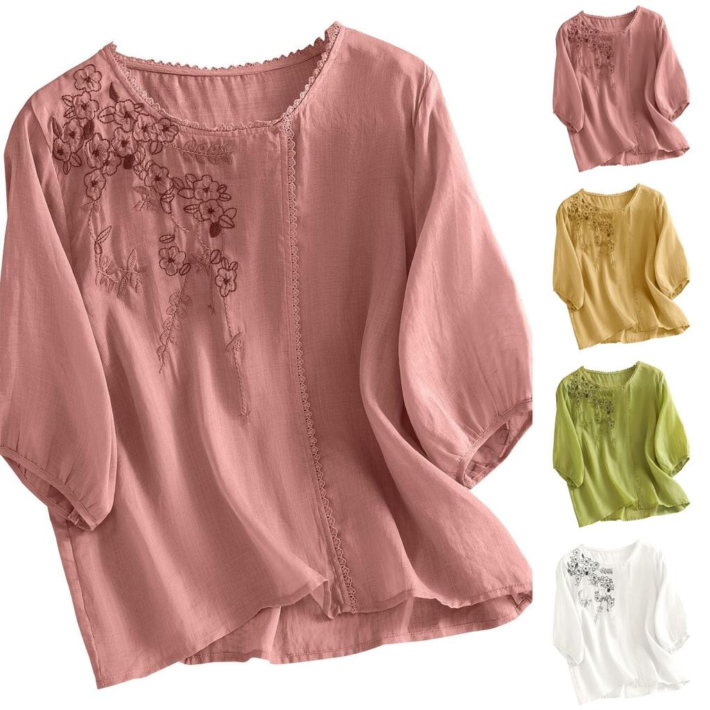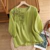 Damen Baumwoll-Leinen Stickerei Locker Retro Rundhals Pullover Top