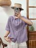 Summer 2026 Retro Embroidered Linen Blouse - Women's Short Sleeve, Slimming Shirt Collar, Loose Fit Top