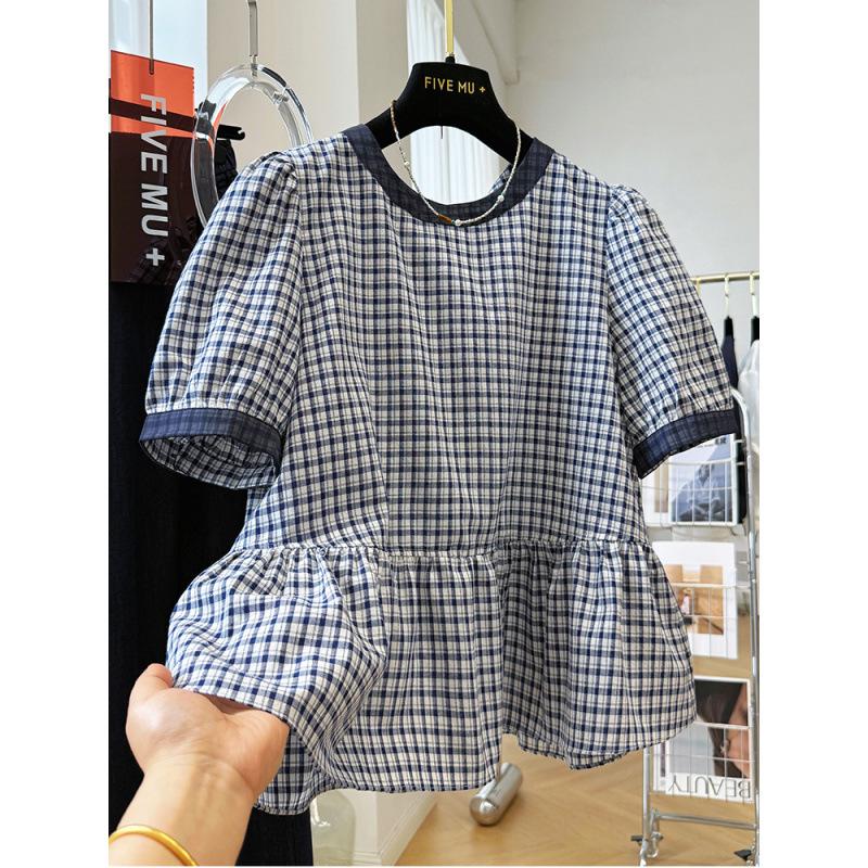 2025 Sommer Koreanisches Leichter Luxus Retro Karomuster Rundhalsausschnitt Kurzarm Locker Puppenoberteil für Damen