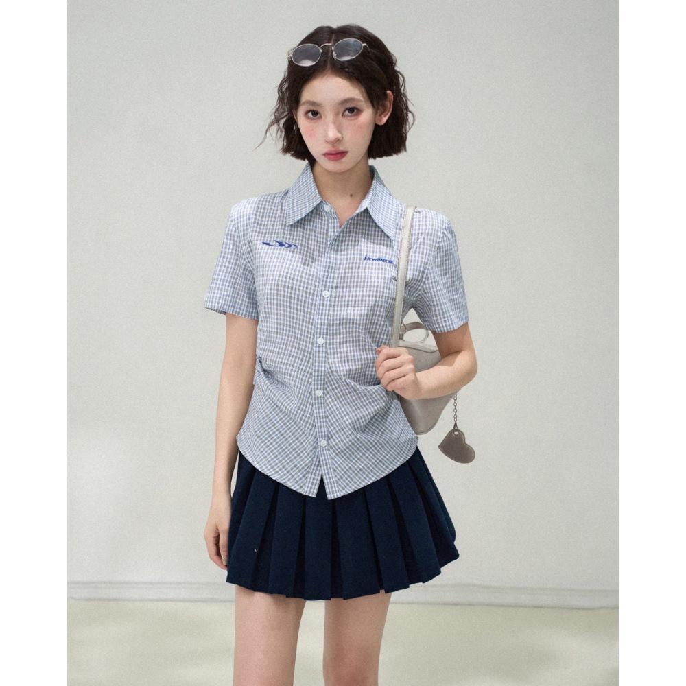 Damen Slim Fit Cropped Blau kariertes Kurzarmhemd, Sommer 2026