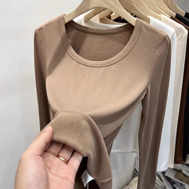 Women's Slim-Fit Double-Sided Plush U-Neck Base Layer Top - Long-Sleeve, Autumn/Winter Warm Inner Wear, 2025 Collection