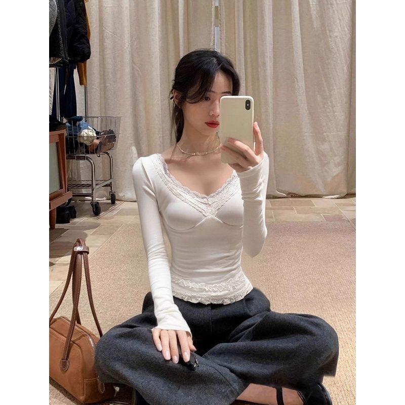 Thermoshirt mit V-Ausschnitt und Spitzenbesatz für Damen, Langarm: Elegante, eng anliegende Basisschicht für Herbst/Winter.