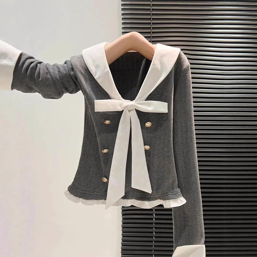 Zweiteiliges College-Stil Faux Longsleeve Oberteil mit Schleife für Damen – Slim Fit, Herbstmode Oberbekleidung