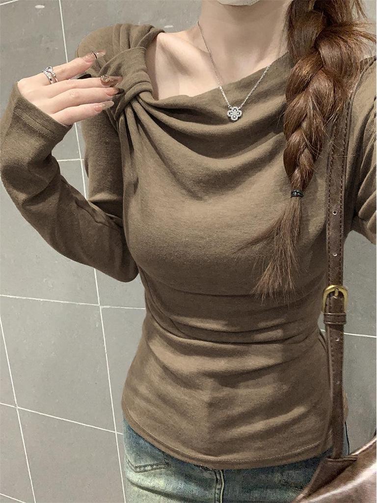 Korean Off-Shoulder Twist Long-Sleeve Slim-Fit T-Shirt for Women, Autumn/Winter Design, Base Layer Top