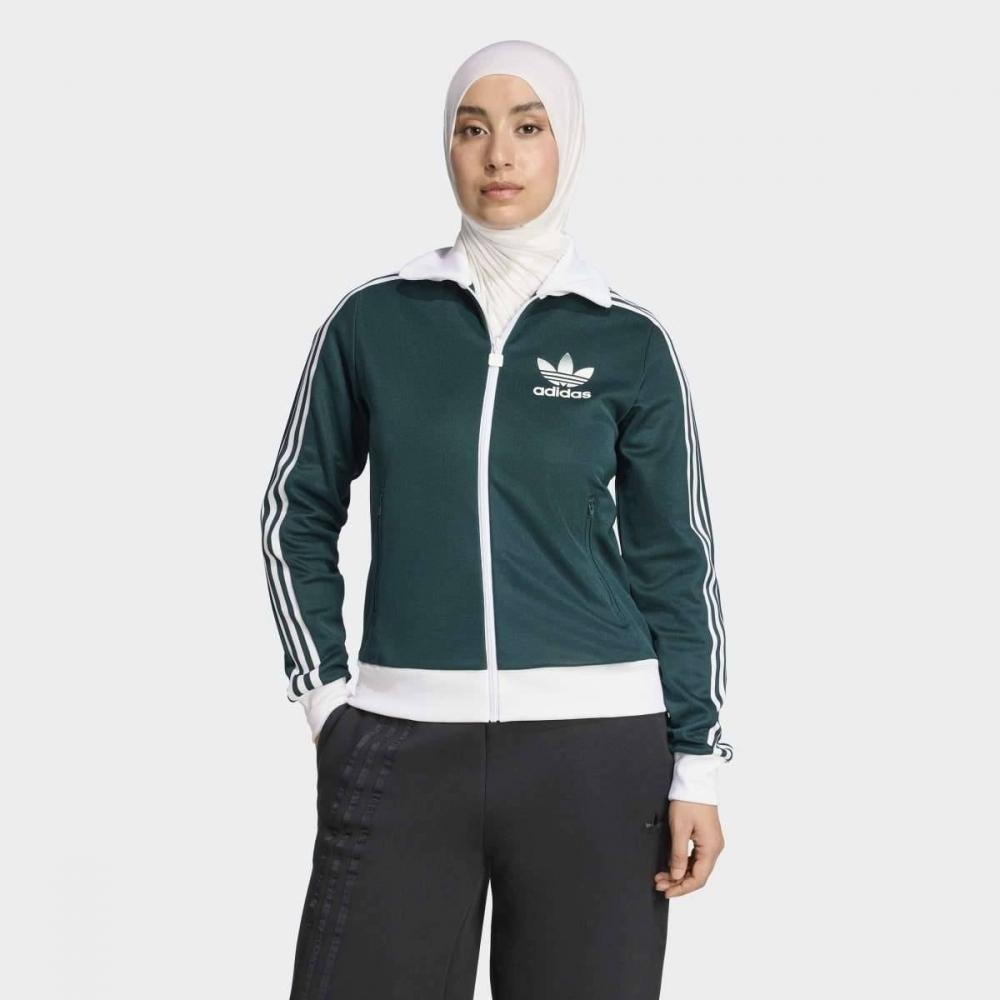 The Adidas Originals Heritage Track Top JX7852 is a women's track top that reinterprets the atmosphere of classic football into a sporty upper. Designed in the Beckenbauer Track Top Green color, it emphasizes iconic elements of the Adidas Heritage collection. Design features include knit cuffs that enhance wearability, color block details that provide visual contrast, and a fold-down collar that completes the classic look.