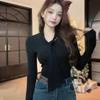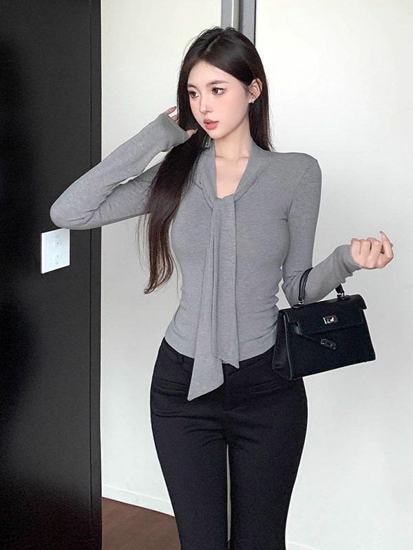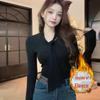 Embrace the elegance of the season with this stylish long sleeve velvet T-shirt, crafted for both comfort and allure. Made from high-quality polyester fiber, this top features a luxurious solid pattern that exudes simplicity and sophistication. The V-neckline, combined with intricate lace-up detailing, adds a touch of femininity and grace to your outfit. With optional thickness, it's perfect for varying autumn and winter climates. The distinct patchwork and quilted decorations elevate its charm, making it a versatile addition to your wardrobe.