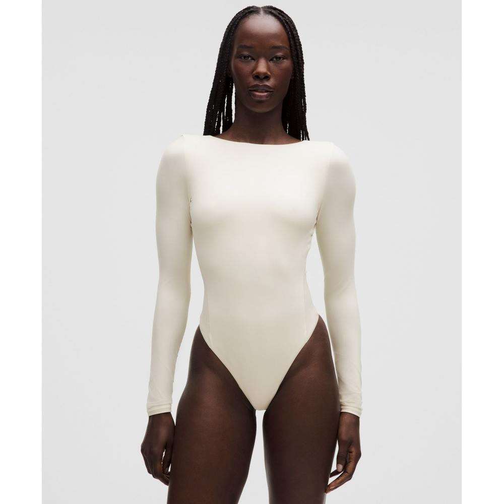 Low back, high impact. Peach-fuzz soft with a low scoop back, this long-sleeve bodysuit has a boatneck front with a built-in shelf bralette to keep your look strap free.