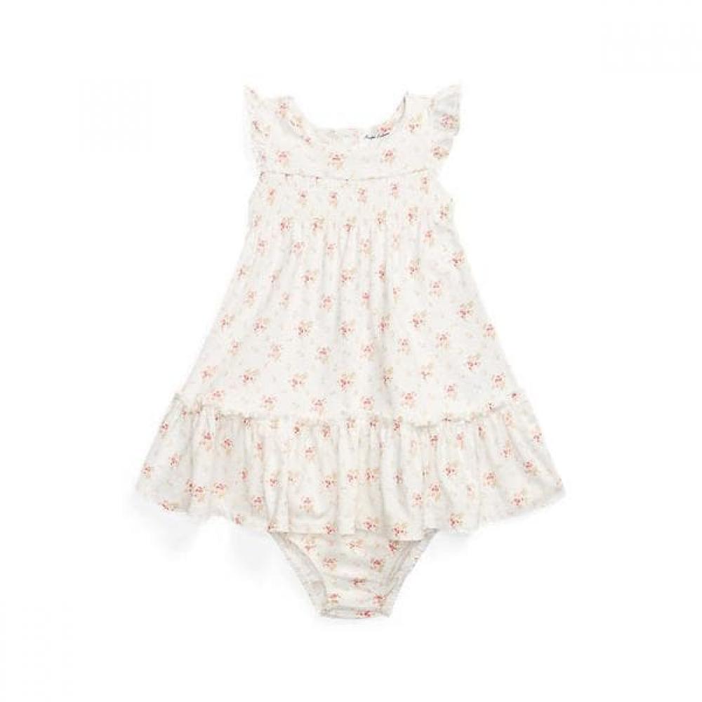 The Ralph Lauren Baby Girls Floral Cotton Jersey Dress with Bloomer creates an adorable look suited for warm weather. Made from cotton jersey material, it provides comfort for the wearer. Features include a draw waist silhouette, a signature pony embroidery on the right hem, a crew neck, a three-button placket at the center back, flutter sleeves with smoke detailing, a ruffled trim flounce hem, and matching bloomers.