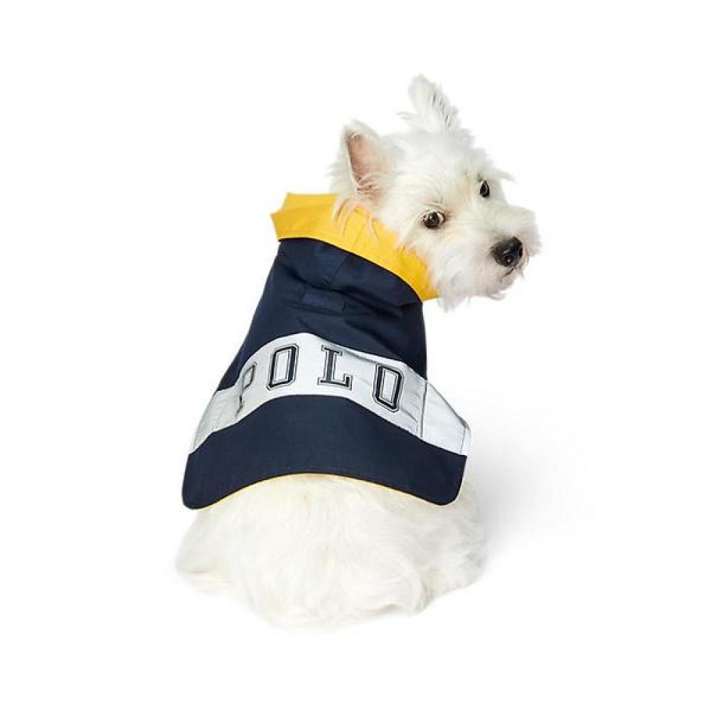 The Ralph Lauren Canvas Logo Dog Raincoat is a canvas raincoat designed for pets, featuring a hood. It has a hook and loop closer at the neck and a signature logo on the back, showcasing Polo's unique style.