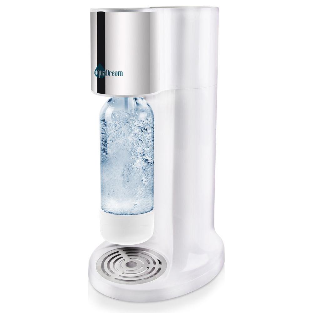 NÜTZLICH - DRINKMATE AquaDream Wassersprudler mit einer 1,1-Liter-Flasche. Abmessungen des Karbonators: 24 x 19 x 42 cm. Der Wassersprudler ist weiß.