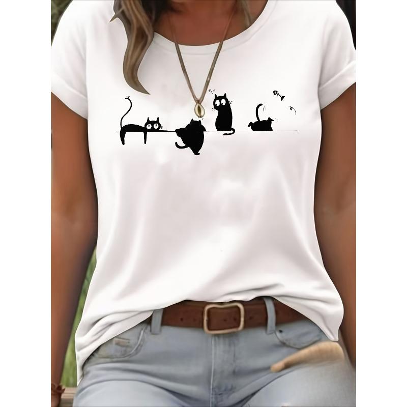 Europäische Größen Sommer Kurzarm Damen T-Shirt mit lustigem dehnbarem Katzen-Design, perfekt für Komfort im Freien und Freizeitkleidung