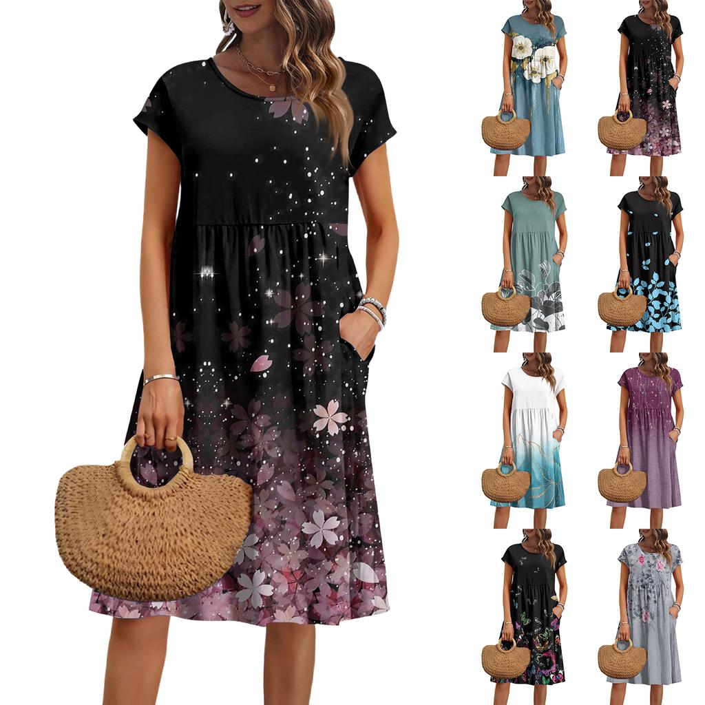 Damen Sommer Mode Lässig Rundhals Kurzarm Blumenmuster Kleid